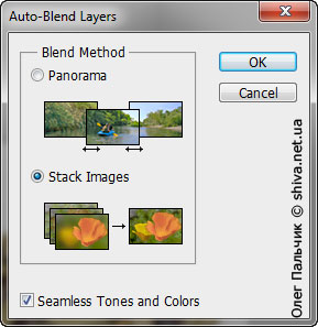 В появившемся окне выбираем опцию "Stack Images". Ставим галочку "Seamless Tones and Colors" (Бесшовные тона и цвета) и жмем ОК.