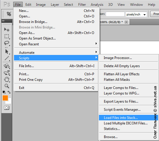 Далее открываем Photoshop, File -> Scripts -> Load Files into Stack и загружаем все снятые кадры.