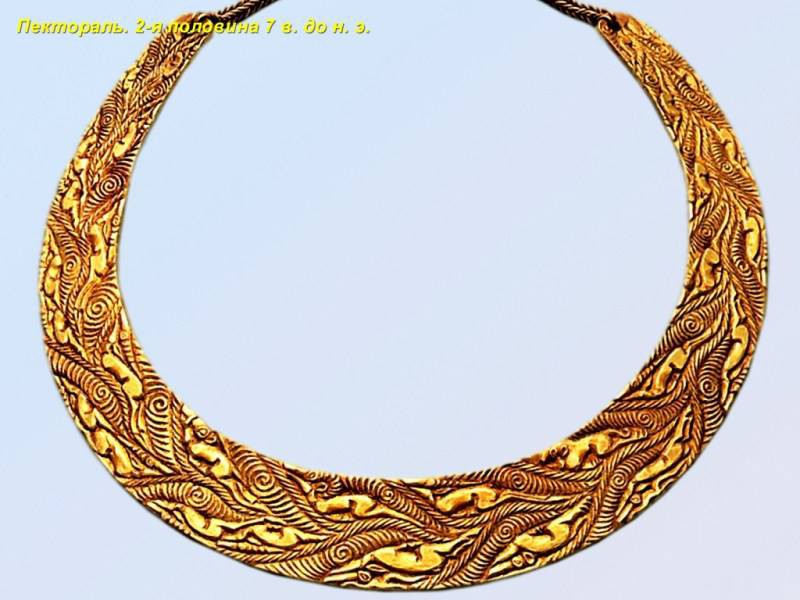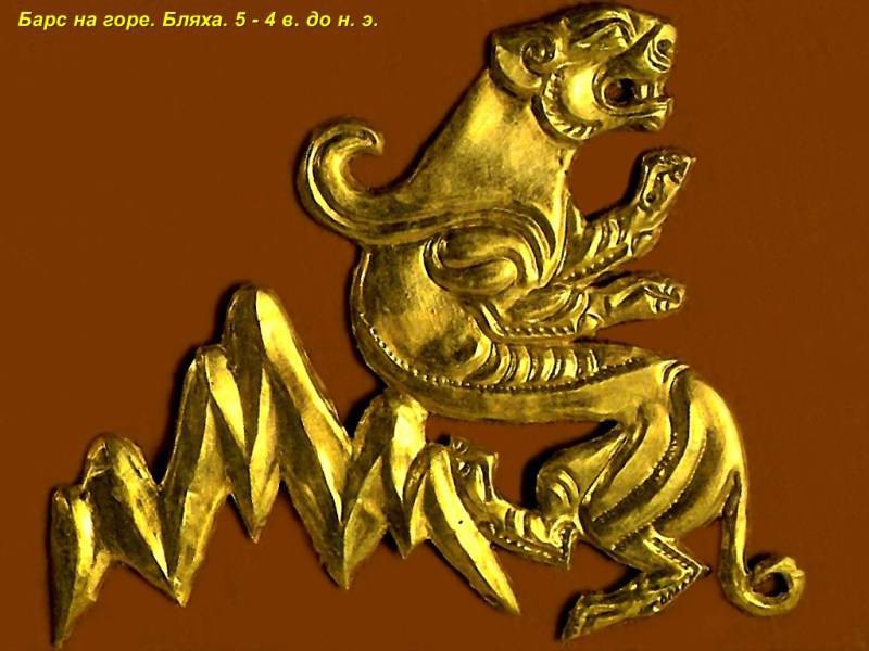 Эгрет в виде грифона держащего в когтях горного козла, золото. Найдено в междуречьи Иртыша и Оби.